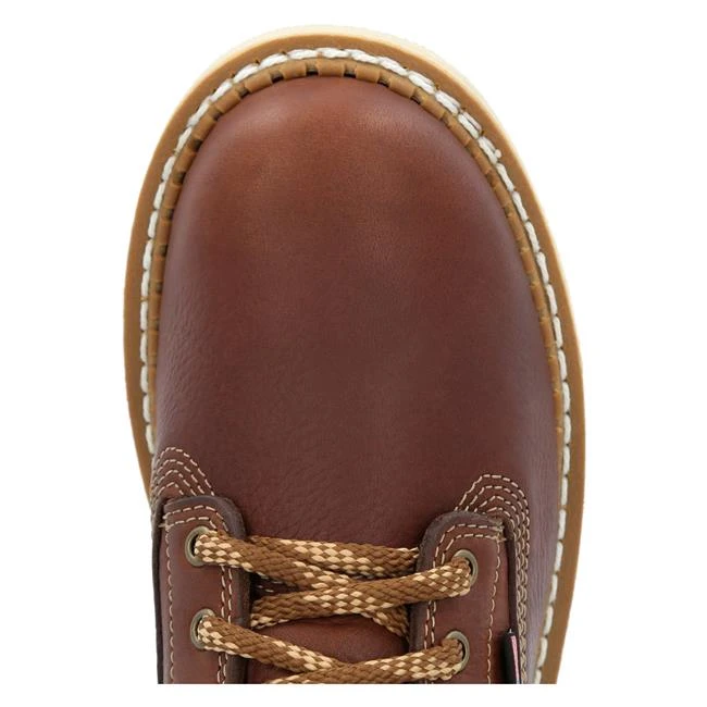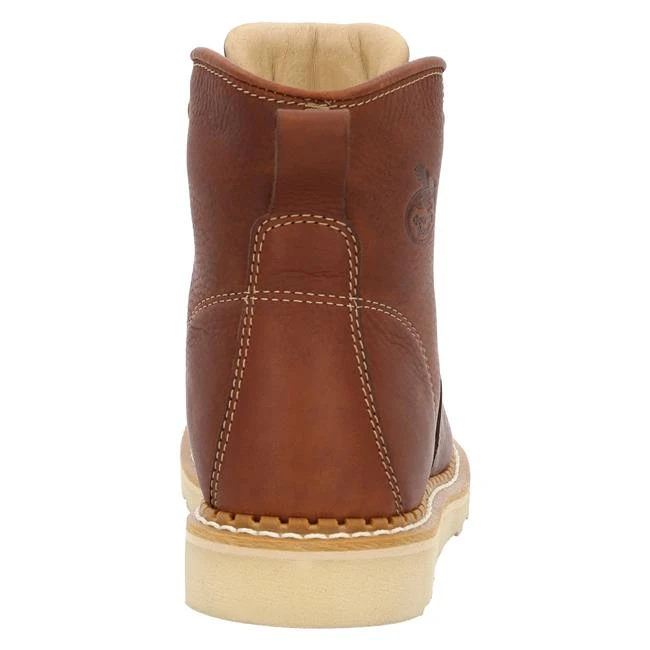 This Georgia Boot 6″ wedge work is built in the USA with the trusted Goodyear welt construction. The unlined upper is crafted from incredibly durable SPR leather. It’s special tanning process makes it three times as strong and two and a half times more abrasion resistant than traditional leathers. The tongue is lined with pig skin and padded for added comfort and milled brass hardware extends the life of the laces. Inside this 6″ US made wedge work boot is the AMP (Advanced Memory Polyurethane) insole. A layer of cushioning polyurethane topped with memory foam provides premium customized comfort. The foundation of this boot is comprised of a steel shank for added stability, shock absorbing EVA midsole and a rubber outsole. It meets ASTM F2892 electrical hazard standards for soft toe footwear.